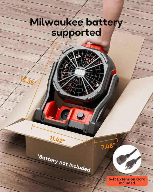 Battery Operated Fan, for Milwaukee M18 18V Battery, Camping Fan Cordless, Option for Corded, with LED Lights, Variable Speed, Hook for Hanging, for Jobsite, Red(Battery Not Included)