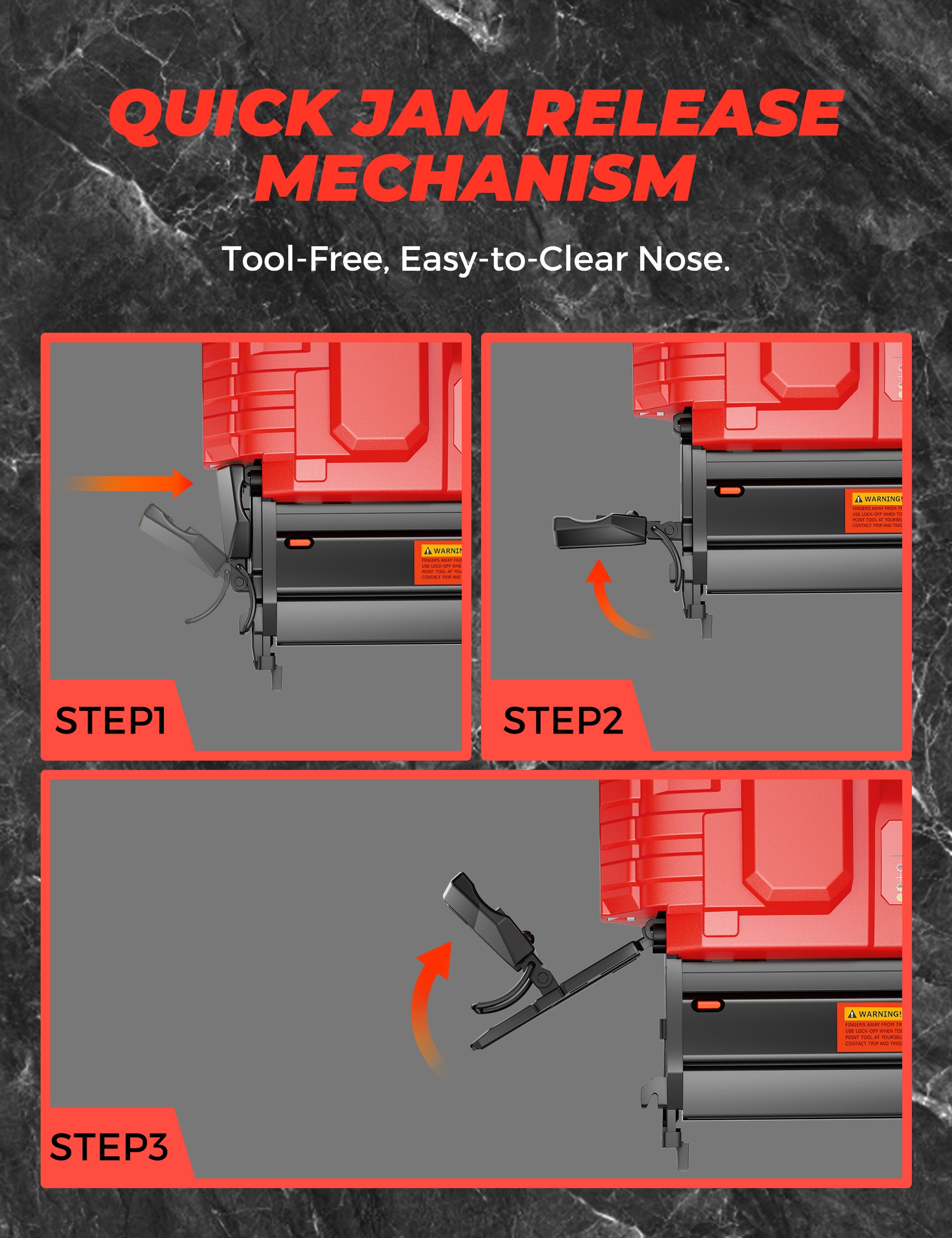 - 【2026 Upgraded Quick Jam Release Mechanism】The DeForce 18-gauge brad nailer features a tool-free jam release. Without relying on screwdrivers, wrenches, or other auxiliary tools, simply press the release button to clear stuck nails within seconds, maintaining a smooth work rhythm. Even in environments where it is inconvenient to carry tools, such as on ladders, in narrow corners, or on outdoor construction sites, it can quickly clear obstacles.